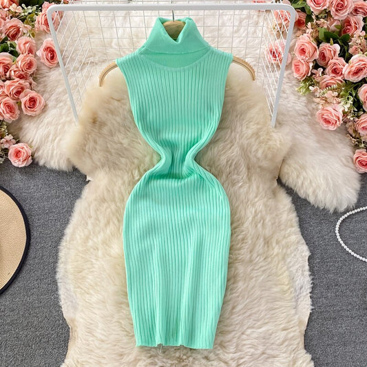 Turtleneck Knit Dress Women Fashion Autumn Solid Sleeveless Bodycon Mini Dress Fashion Streetwear Sexy Party Tight Dress