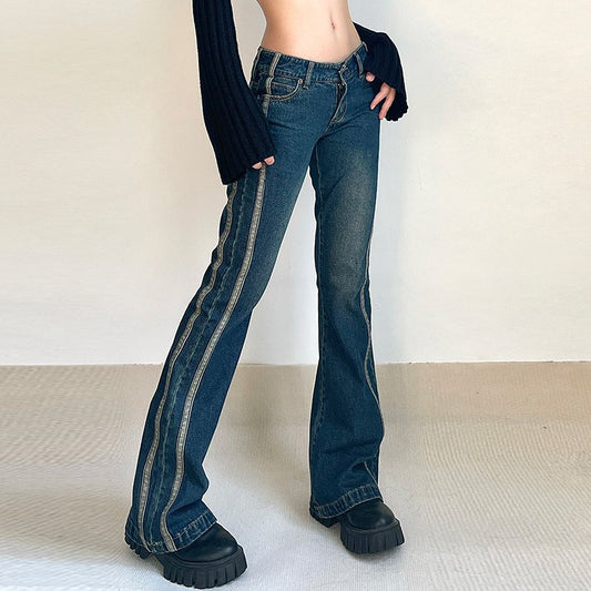 Vintage flared jeans gestreepte stiksels Skinny Lae opkoms denim broek Vroue gemaklik