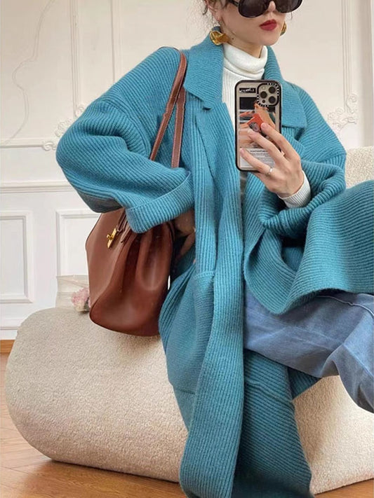 Knitting Cardigan Thicken Long Sweater Coat For Women Solid Lapel Loose Casual Vintage Clothing Autumn Winter
