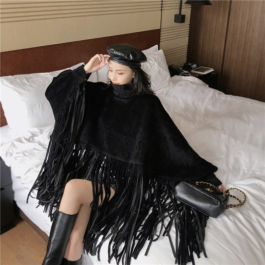 Overcoat New Fashion Streetwear Batwing Sleeve Faux Mink Cashmere Tassel Cloak Coat