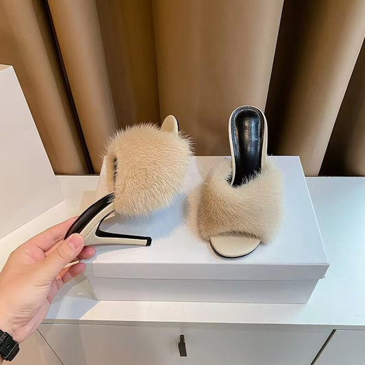 New slim heel open-toe sandals women's mink hair sexy fashion one-half hair high-heeled sandals