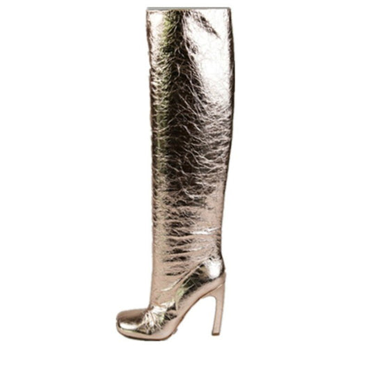 Processing Time:7-15 days after placing orders Women's Fashion Sexy Color Butterfly Decoration Square Head High Boots Autumn and Winter New Slope Heel Party Show Skirt Shoes