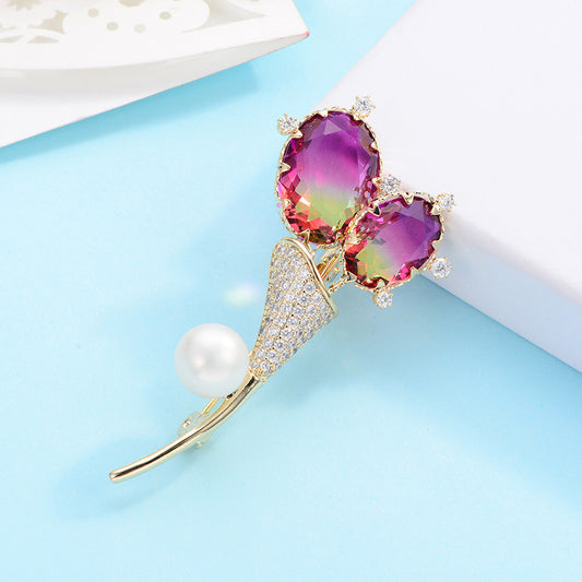 Temperament Fashion Tourmaline Brooch Light Luxury Exquisite Pearl Zircon Flower Corsage Dress Pin